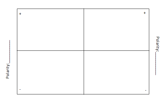 A template for a polarity map is shown in the following graphic. The strategic-operational tension is shown on the left and right. Note the symbols in the corners. The “+” sign is a place for capturing the advantages of that pole, and the “-” sign is for the disadvantages. Thus,