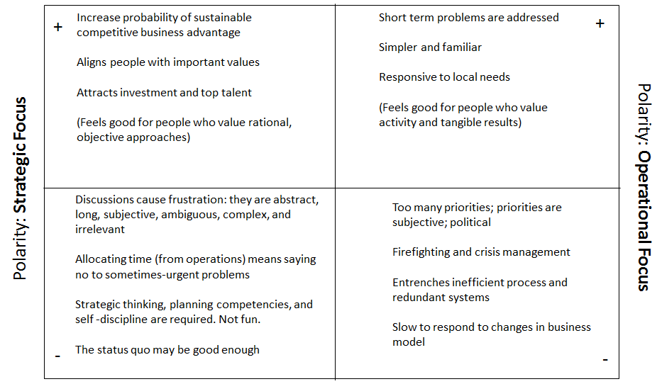 Here is a completed polarity map for the strategy-operational tension. Examine the perceived advantages and disadvantages of each perspective. Notice the presence of items in each of the four quadrants: it illustrates a somewhat complete picture of operations and strategy. Notice the upsides and downsides of each perspective; neither is perfect.