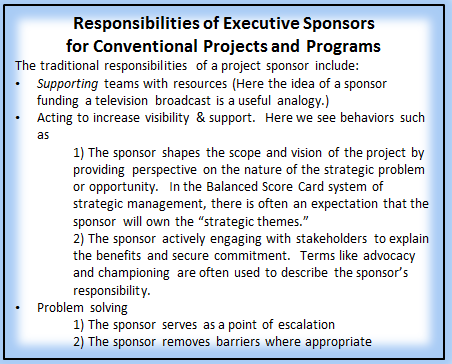 - The traditional responsibilities for an executive sponsor apply (see the graphic). However,