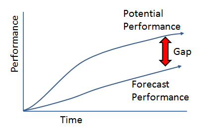 Notice the two trend lines showing the forecast performance (what will happen if we do nothing) and the potential performance (what we desire). The performance gap involves a tension between the current state and a desired future state.