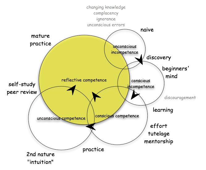 “We revisit conscious incompetence, making discoveries in the holes in our knowledge and skills, becoming discouraged, which fuels incentive to proceed (when it does not defeat). We perpetually learn, inviting ongoing tutelage, mentoring and self-study (ongoing conscious competence). We continually challenge our ‘unconscious competence’ in the face of complacency, areas of ignorance, unconscious errors, and the changing world and knowledge base.”